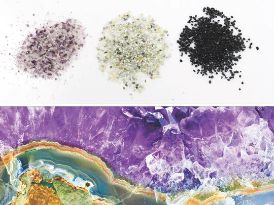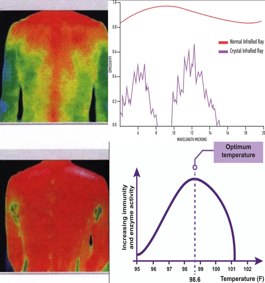 Purple Amethyst is well-known for its unique crystal peaks in the FIR spectrum, while Tourmaline is pyroelectric and piezoelectric, which naturally releases negative ions upon pressure or heating.